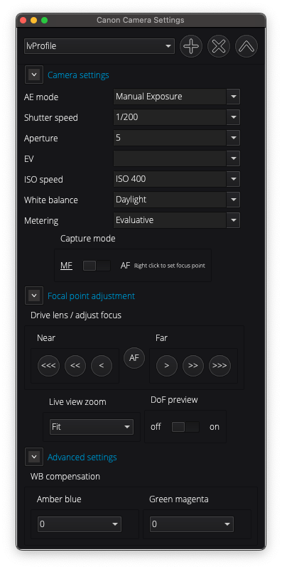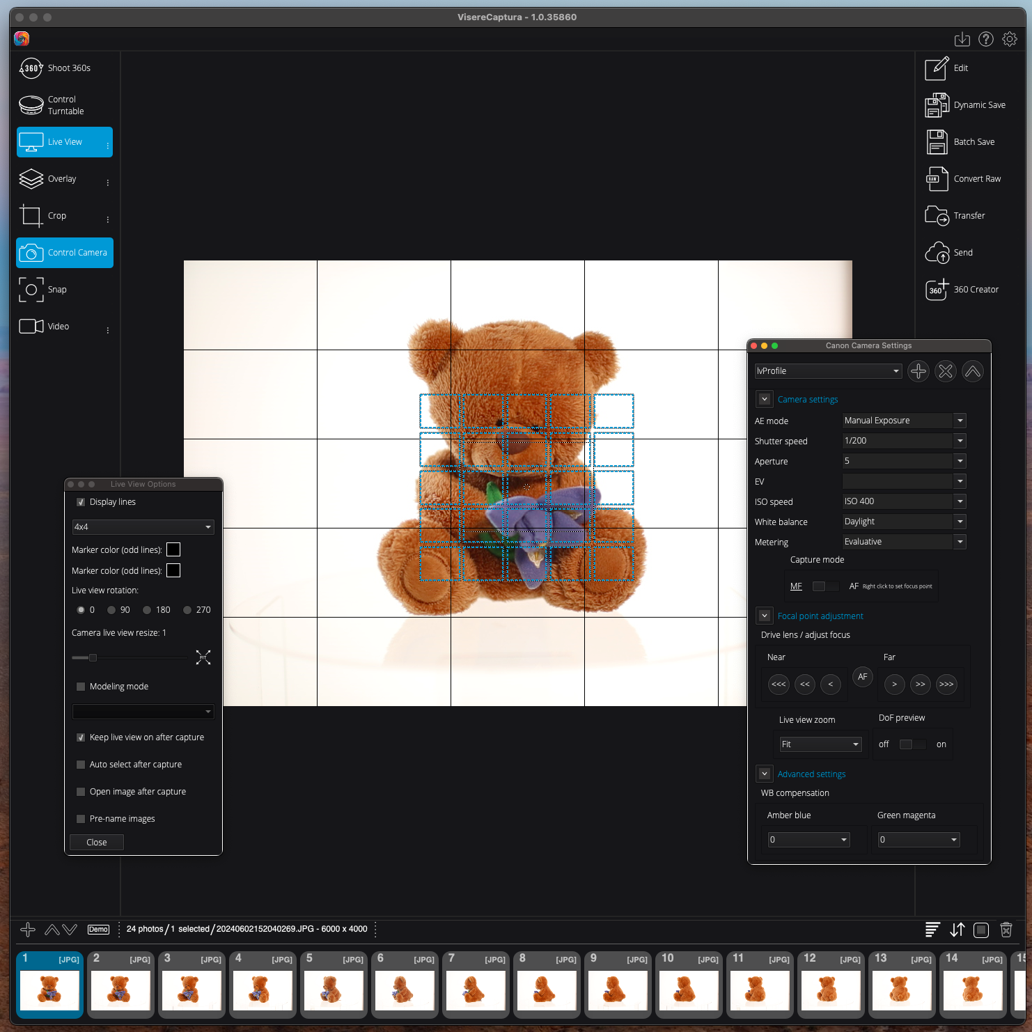 In Visere Captura, users can fine-tune camera settings through simple mouse clicks to achieve optimal exposure. These adjustments encompass exposure elements like Aperture, Shutter Speed, White Balance, ISO, and more. Additionally, users can set focal points with ease. As adjustments are made, the 'Live View' feature dynamically simulates image exposure in real time, enabling users to preview exposure levels before capturing the image (*requires a camera with exposure simulation capability). Users can also save multiple 'Camera Settings Profiles' for future use, ensuring consistency in imaging.