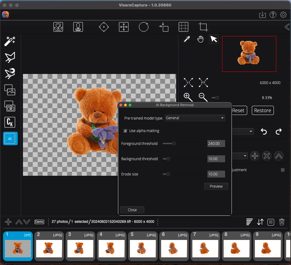 After capturing images, enhance them using Visere Captura's comprehensive editing suite. This includes tools for color correction, image enhancement, and a wide range of background removal tools, including our newest artificial intelligent background removal tool, Background Removal Pro. Edits can be applied individually or in batches. Users can also create and save 'Editing Profiles' for quick application to other images or during capture, streamlining the workflow.