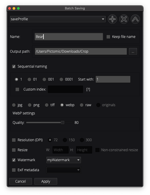 The final step involves outputting the images. Visere Captura allows for batch editing and automated output. Users can specify save locations (local, networked, cloud, FTP), define naming conventions, choose formats (WEBP, JPG, PNG, TIFF, RAW), set resolution (DPI), adjust size (pixels), and add watermarks. Multiple image sets with different properties can be outputted for various needs. Batch saving is executed with one click, and 'Save Profiles' can be saved for future use.